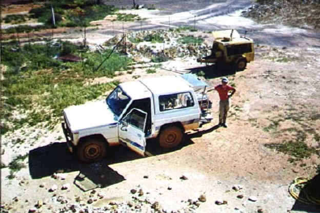 A view, taken from the top of our mullock heap, of our mining vehicle with generator in the back, and an air compressor in the background.