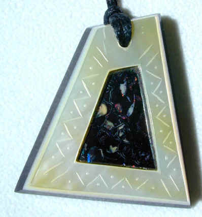 Yowah Matrix Opal in gold lipped Mother of Pearl (Australian) and Australian water buffalo horn etched with aboriginal design.