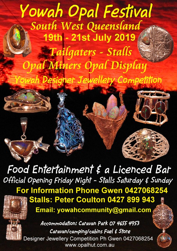 Relax and enjoy a great evening meal, and then dance the night away Designers and Metalsmiths - Enter the Yowah Opal Festival Designer Jewellery Competition. It is a gem of a place this little four block town in Outback Queensland, and we celebrate our uniqueness with an annual festival - The Yowah Opal Festival. Yowah's opal celebration occurs on the third weekend of the month of July each year. Located two hours drive from Cunnamulla on a sealed road. World class museum specimens of Yowah Nut Opal, Ironstone Matrix Opal, Opalized Wood Opal, Yowah Boulder Opal and Boulder Opal are on display as the locals share their prize collections with all. The Yowah Opal festival is fully catered and licensed for the week -end. Morning and afternoon tea, and three meals a day are cooked on the premises. Fresh food is provided including pit roasts, bar-b-ques, and smorgasbord for a three day bit of variety, including breakfast all days and on Monday before guests hit the track. Music and dancing is part of the festivities. The townspeople encourage everyone to talk to a miner. Yowah is billed as the "friendly" opalfield and the people gather to prove to you why. The town of Yowah is named after the opal field it grew from, and the Yowah opal field got its name from a creek that runs through it. In the 1890's the Yowah opal centered nut was feverishly mined. Today both the Yowah gem nut and its cousin, the Yowah opal matrix nut are equally sought after by both a national and an overseas gem market.