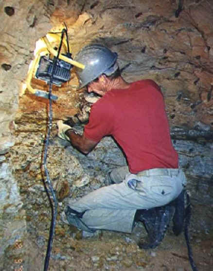 Bob using the air hammer in his tunnel. You can see where the sandstone meets the clay level. Where the two levels meet is where we should find the opal